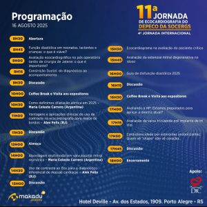 A Sociedade de Cardiologia do Estado do Rio Grande do Sul (SOCERGS), por meio de seu Departamento de Ecocardiografia (DEPECO), promove no dia 16 de agosto, das 8h30 às 18h, a 11ª Jornada de Ecocardiografia, no Hotel Deville Prime Porto Alegre, localizado na Avenida dos Estados, 1.909. O evento é voltado para cardiologistas, ecocardiografistas, residentes e demais profissionais da saúde interessados em aprofundar seus conhecimentos sobre a ecocardiografia — técnica essencial no diagnóstico por imagem das doenças cardíacas.
