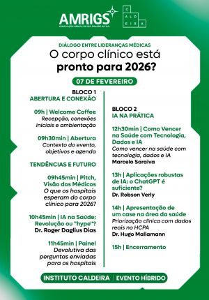 Organizado pela AMRIGS em parceria com o Caldeira, o encontro híbrido tem como proposta estimular a troca de vivências, apresentar programas e iniciativas já em andamento e fomentar o diálogo sobre possíveis caminhos para qualificar processos, aprimorar a jornada do paciente e fortalecer a sustentabilidade dos serviços de saúde.