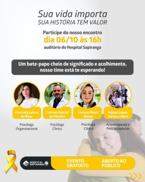 No dia 6 de outubro (segunda-feira), às 16h, o auditório do Hospital Sapiranga recebe um encontro especial sobre valorização da vida. A programação é gratuita e aberta ao público, reunindo profissionais de psicologia e duas pet terapeutas que prometem tornar a experiência ainda mais acolhedora: Sereia, uma égua usada nas terapias e Akira, uma cachorrinha carinhosa e brincalhona.