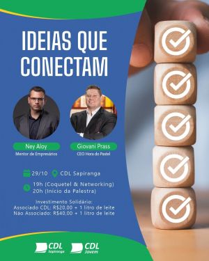 A Câmara de Dirigentes Lojistas de Sapiranga (CDL Sapiranga), por meio da CDL Jovem, realiza na terça-feira, (29/10), o evento ‘’Ideias que Conectam’’, que promete uma noite de inspiração, aprendizado e networking entre empresários e empreendedores da região. O encontro ocorre na sede da entidade e tem foco em gestão, inovação e marketing estratégico.