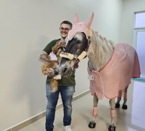 Um dos momentos mais marcantes foi a presença das pets terapeutas da instituição, a Sereia, uma égua mansa e amorosa, e a Akira, uma cachorrinha carinhosa e brincalhona, que encantaram os participantes e estimularam afeto, conexão e bem-estar. A atividade com os animais foi conduzida com apoio da arteterapeuta e tutora Rejane Lopes, que acompanhou o momento e auxiliou na integração da experiência.
