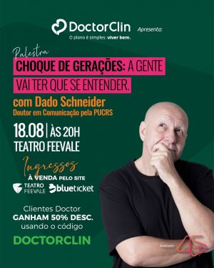 Como lidar com a chegada da Geração Z ao mercado de trabalho? Qual o impacto do avanço tecnológico nas relações profissionais? E como transformar equipes diversas em times cooperativos e produtivos? Essas são algumas das questões que guiam a palestra "Choque de Gerações - A gente vai ter que se entender", apresentada pelo comunicador Dado Schneider, no dia 18 de agosto (segunda-feira), no Teatro Feevale, em Novo Hamburgo (RS)