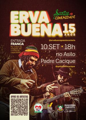 O Asilo Padre Cacique será palco de uma noite especial de arte e cultura no dia 10/09, quarta-feira, às 18h, quando recebe o quarto espetáculo do projeto Sarau do Solar na Comunidade – Música e Diversidade, realizado pela Assembleia Legislativa do Rio Grande do Sul. A atração será o duo Erva Buena, formado pelos artistas uruguaianenses o músico Nandico Saldanha e o poeta Rafael Ovídio, que apresentam canções autorais intercaladas com declamações poéticas. A entrada é gratuita.