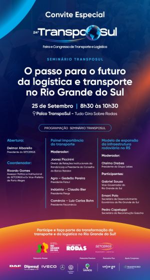 A 24ª TranspoSul é uma realização do SETCERGS. Patrocinadores Masters: Dipesul Volvo, Iveco, Mercedes-Benz, Volkswagen Caminhões e Ônibus, DAF Eldorado Caminhões e Governo do Estado do Rio Grande do Sul; Patrocinador Premium: Grupo Vamos. Patrocinador Plus: Veloe Go. Apoiador do Congresso: Transpocred. Para mais informações acesse https://transposul.com/