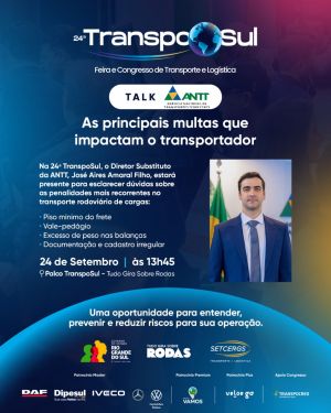 No dia 24/09 (quarta-feira), às 13h45, no Palco TranspoSul – Tudo Gira Sobre Rodas, o diretor substituto da ANTT, José Aires Amaral Filho, ministrará a talk “As principais multas que impactam o transportador”, abordando penalidades recorrentes no transporte rodoviário de cargas, como Piso mínimo do frete; Vale-pedágio; Excesso de peso nas balanças e Documentação e cadastro irregular. Além de esclarecer dúvidas, este encontro oferece ao empresário a chance de antecipar tendências regulatórias e aplicar estratégias que impactam diretamente no dia a dia da operação. É conhecimento que gera segurança, otimiza processos e protege resultados.
