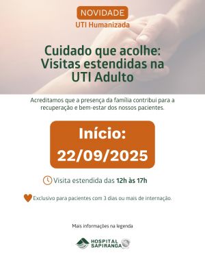 A partir de 22/09, o Hospital Sapiranga dará início à implantação da visita estendida na UTI Adulto, dentro do projeto de UTI Humanizada. A iniciativa permitirá que familiares permaneçam junto ao paciente das 12h às 17h, todos os dias, reforçando o acolhimento e o papel da presença afetiva na recuperação. A medida será válida para pacientes com três ou mais dias de internação.
