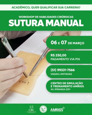 Estudantes de Medicina terão a oportunidade de aprimorar competências essenciais da prática cirúrgica no Workshop de Habilidades Cirúrgicas | Sutura Manual, que será realizado nos dias 6 e 7 de março, no Centro de Simulação e Treinamento da Associação Médica do Rio Grande do Sul (AMRIGS), em Porto Alegre. A atividade combina aulas teóricas e práticas supervisionadas, com foco no desenvolvimento técnico, na segurança do procedimento e na preparação para os desafios da formação médica.